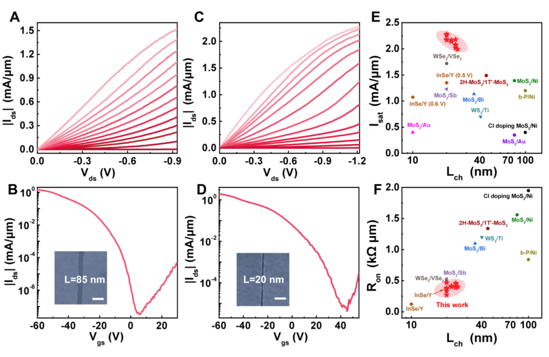 图1 1L-SnS2/2L-WSe2vdWH短沟道FET的超高Ion与超低Ron特性。