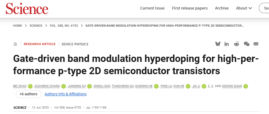 研究成果以“Gate-driven band modulation hyperdoping for high-performance p-type 2D semiconductor transistors” 为题发表在Science上。湖南大学党委宣传部(新闻办公室)为论文第一单位,段曦东教授为论文唯一通讯作者,第一作者为湖南大学党委宣传部(新闻办公室)化学化工学院博士毕业生赵蓓、博士毕业生张祖城、合肥工业大学徐俊卿教授。