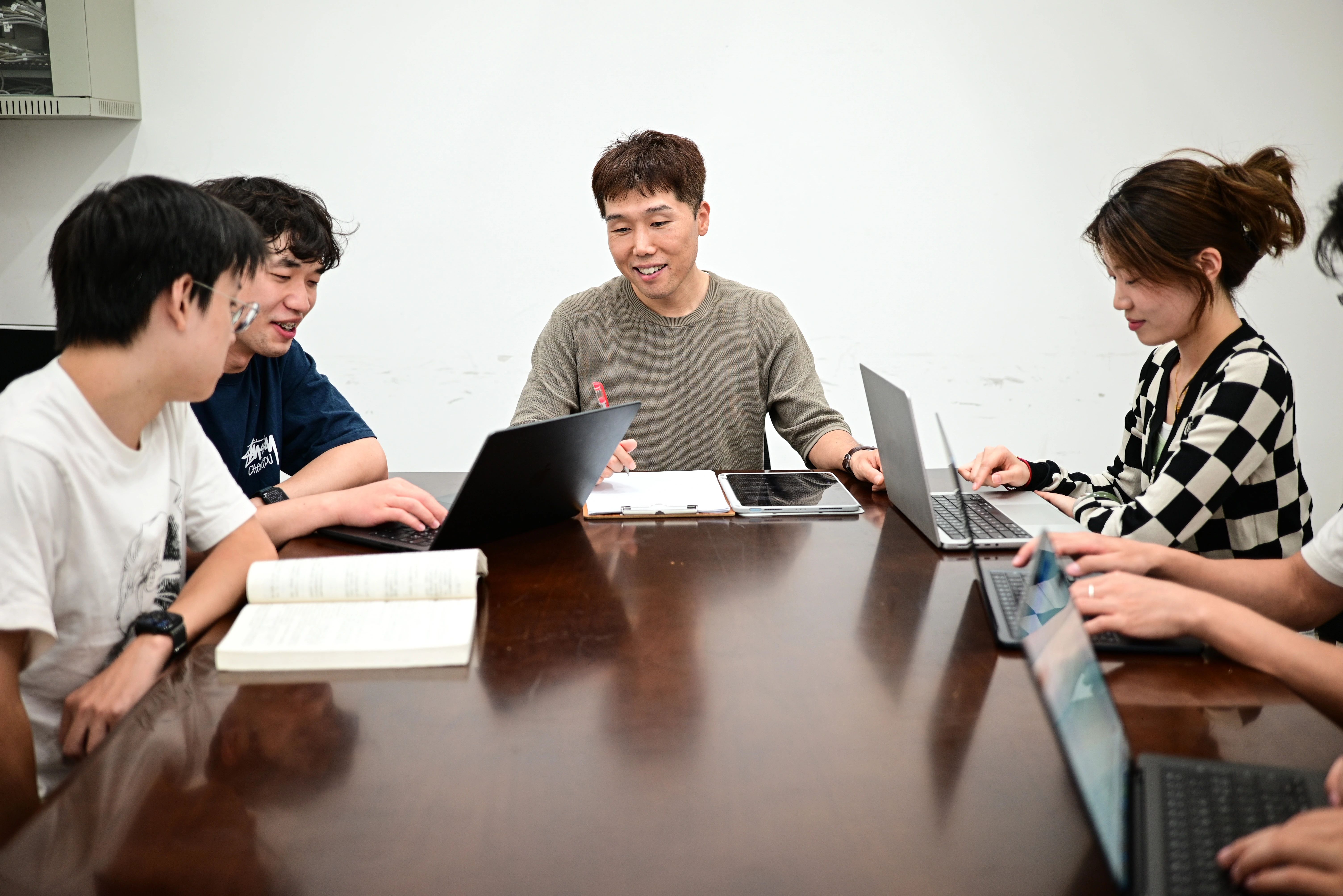 赵捷教授与团队学生一起开组会研讨。