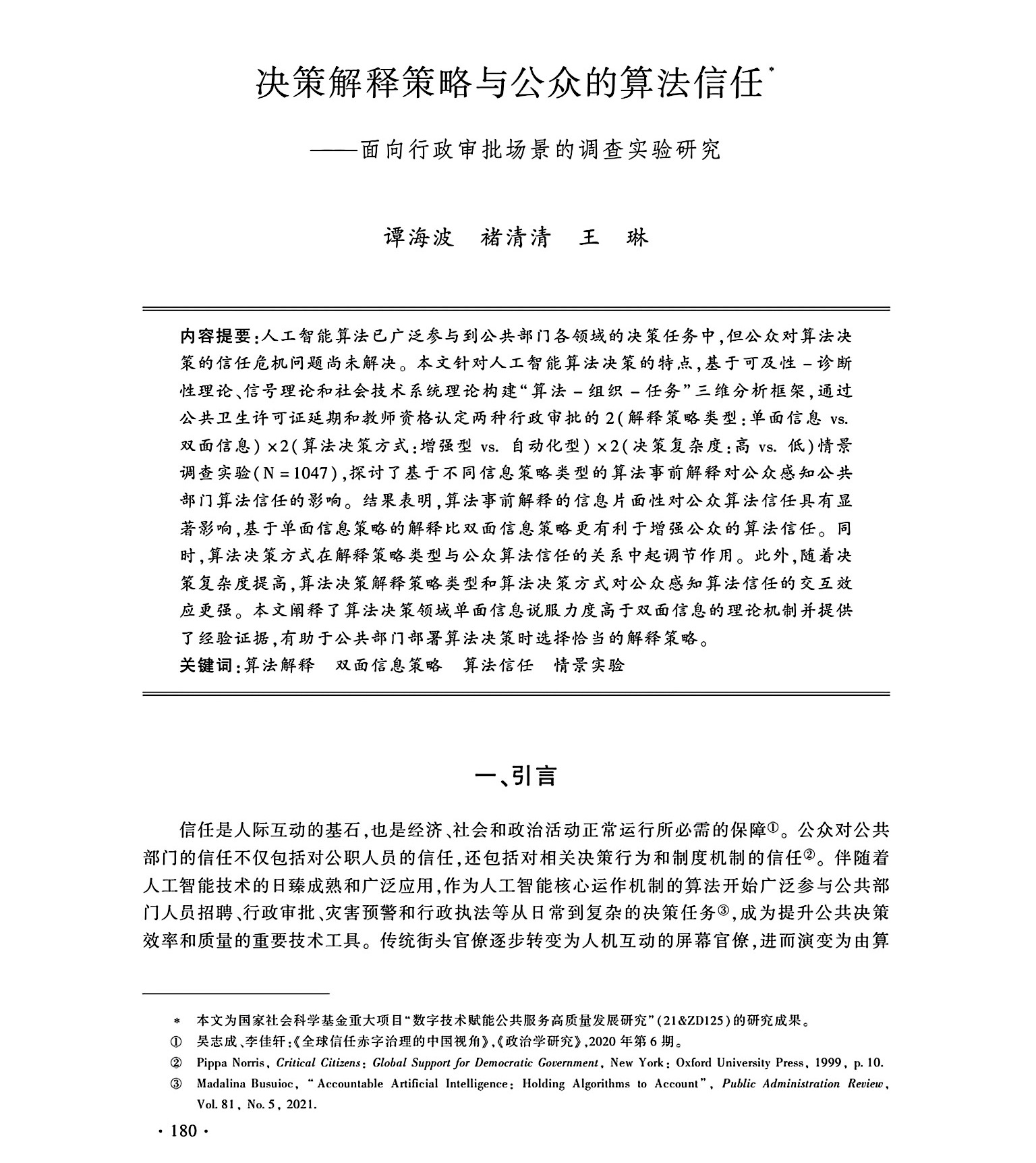 近日,公共管理学院谭海波教授在算法决策领域取得新进展。研究成果以《决策解释策略与公众的算法信任——面向行政审批场景的调查实验研究》在权威期刊《政治学研究》2025年第3期发表。随着人工智能技术的广泛应用,算法已深度参与公共部门决策,但公众对算法决策的信任危机问题尚未解决。本研究针对人工智能算法决策的特点,基于可及性-诊断性理论、信号理论和社会技术系统理论构建“算法-组织-任务”三维分析框架,通过公共卫...