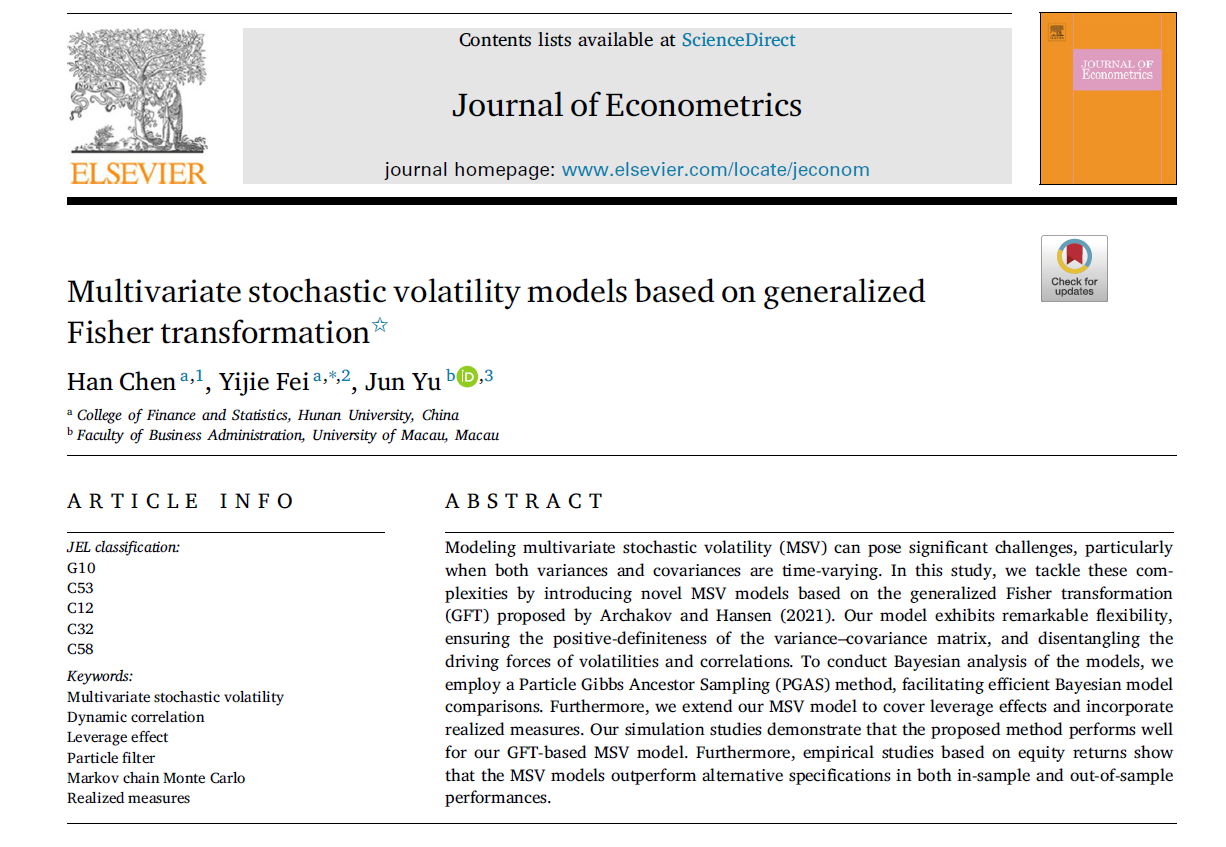 近日,金融与统计学院陈汉助理教授、费毅捷助理教授合作完成的学术论文“Multivariate stochastic volatility models based on generalized Fisher transformation”在计量经济学国际顶尖期刊Journal of Econometrics在线发表。随机波动模型是研究金融数据时变波动率的重要工具,而如何构建既“时变”且“正定”的波动率矩阵,一直是该领域的核心难题。为此,本研究借鉴文献中最新提出的广义 Fisher 变换,设计了一种全新的多元...