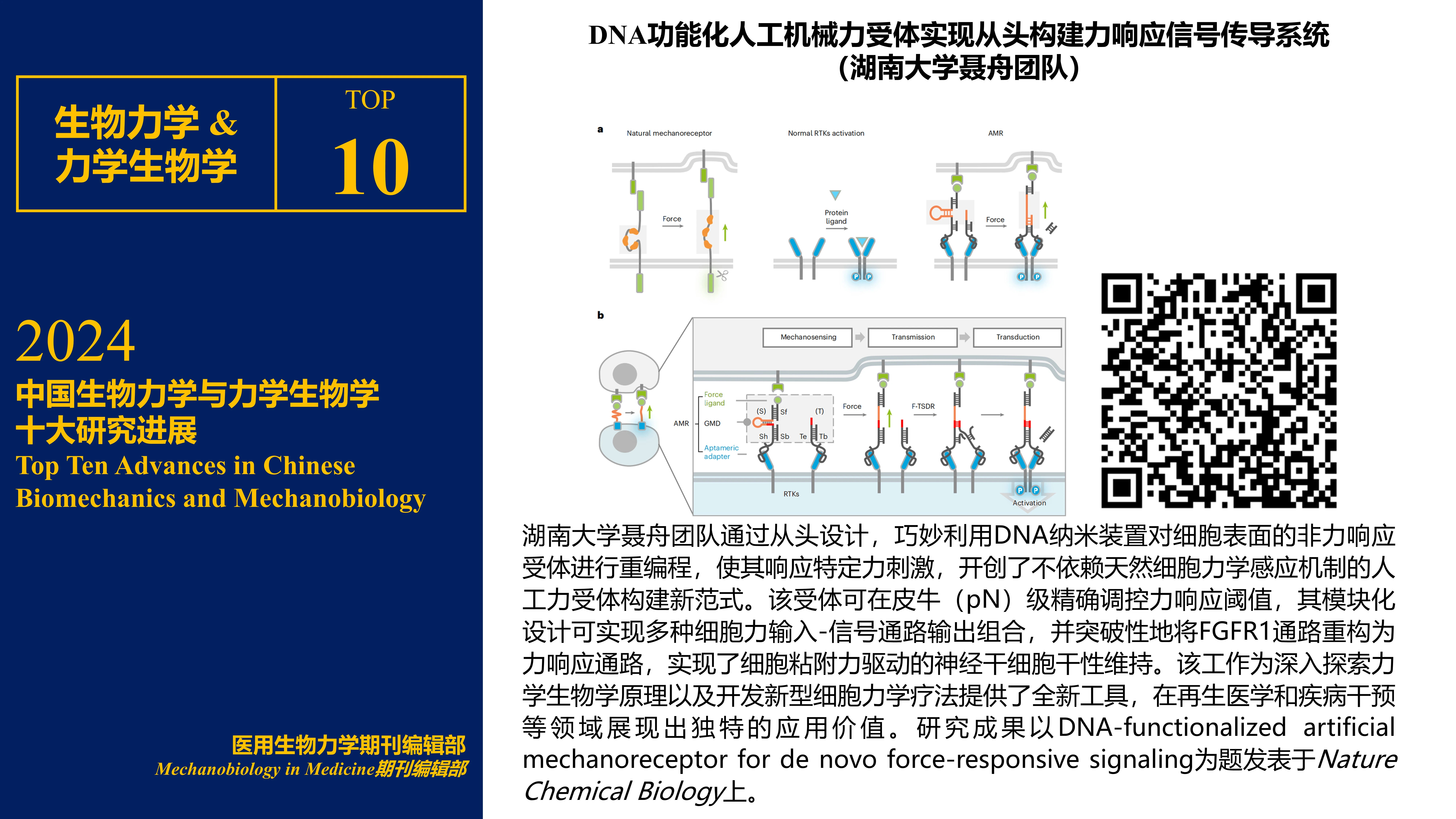 近日,化学化工学院聂舟教授团队发表于国际期刊《Nature Chemical Biology》的研究成果“DNA-functionalized Artificial Mechanoreceptor for de novo Force-responsive Signalling”入选“2024年度中国生物力学与力学生物学领域十大进展”,评选结果正式公布并刊登在《医用生物力学》杂志。该研究成果采用分子从头设计策略,首创了一种DNA功能化人工机械力受体(AMR),通过化学合成的DNA纳米装置重构细胞表面受体功能,赋予非...